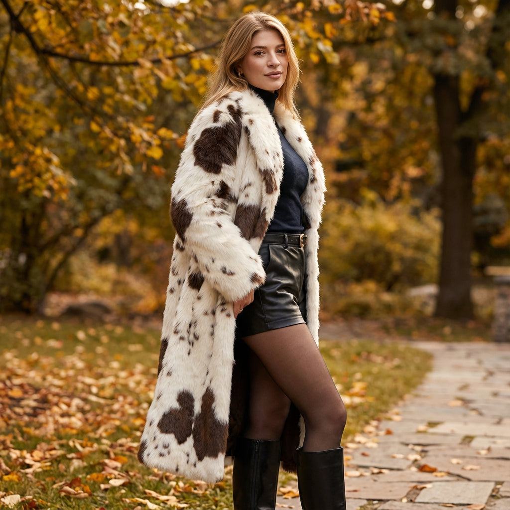 Entra en la temporada de invierno con estilo con el Abrigo de Piel Sintética Nina. Este impresionante abrigo largo presenta un elegante diseño de estampado de vaca, perfecto para hacer una declaración mientras te mantienes abrigada. Confeccionado con piel sintética de alta calidad, ofrece una sensación suave y esponjosa, asegurando comodidad y elegancia en cada uso.
