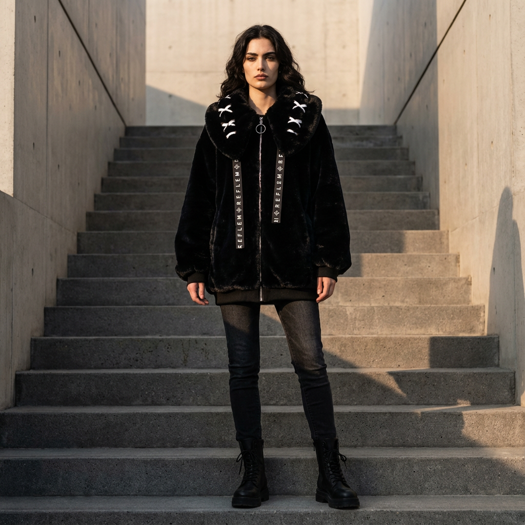 Difumina la línea entre lo acogedor y lo llamativo con la Chaqueta con Capucha de Piel Sintética para Mujeres Neko. Disponible en blanco nítido y negro profundo, esta chaqueta de gran tamaño con cremallera está confeccionada con una suave y esponjosa piel sintética que te envuelve en calidez desde la primera puesta. Las orejas de conejo esculpidas destacan en la capucha, cada una detallada con un atrevido bordado en cruz para un contraste lindo y audaz. Cintas de cordón planas con la marca cuelgan de un tirador de cremallera con anillo plateado en el centro, añadiendo un acabado elegante y listo para la calle a una silueta de otro modo caprichosa. Los puños acanalados mantienen el ajuste ceñido en las muñecas mientras que el cuerpo relajado y de gran tamaño se mueve sin esfuerzo contigo — una parte acogedora y otra parte iniciadora de conversación.