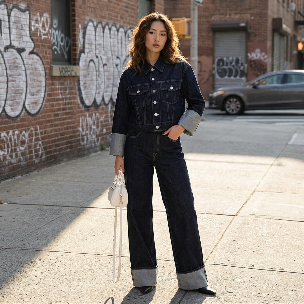 Este conjunto de mezclilla para mujeres incluye una chaqueta corta combinada con jeans de pierna ancha a juego. La chaqueta presenta una silueta estructurada con un cuello puntiagudo, cierre frontal de botones y mangas largas terminadas con puños doblados. Los jeans están diseñados con un corte recto de pierna ancha y un perfil de longitud completa. Adecuados para un estilo casual, las piezas se pueden usar juntas o combinarlas por separado.